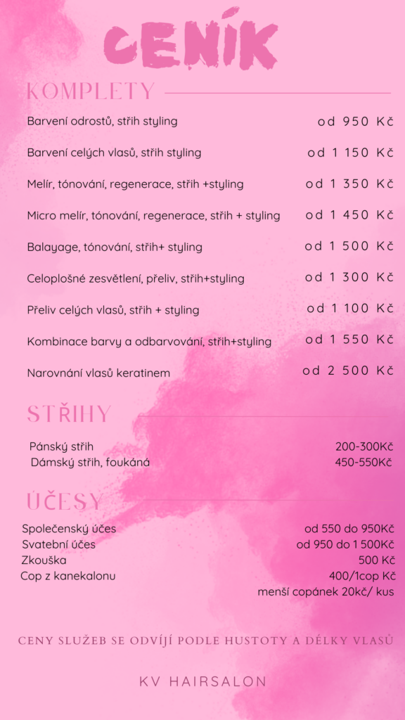 Kadeřnictví v salonu Carmen&clinic pod vlastním názvem KV hairsalon je jedním ze salónů kde vám nabídneme stříhání dámské, pánské ale i dětské. Naleznete u nás všechny kadeřnické služby jako barvení přírodních i extravagantních odstínů, nejnovější techniky odbarvovaní, zažehlování keratinem nebo pánské úpravy vousů, vlasů a spousty dalších. Vaše přání vám splní kadeřnice Kateřina Valentová.